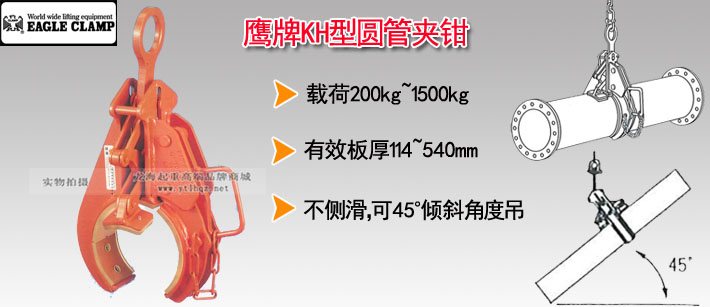 【產(chǎn)品名稱】鷹牌KH型圓管夾鉗,鷹牌KH型圓鋼起吊鉗 【產(chǎn)品品牌】日本EAGLE CLAMP鷹牌 【產(chǎn)品規(guī)格】200kg~1500kg 【產(chǎn)品保質(zhì)】保質(zhì)期12個月 【是否現(xiàn)貨】部分型號有庫存 【分類】圓管夾鉗 【用途】管狀物無損傷運輸、搬運、鋪設(shè)、配管 【適用鋼材】鑄鐵管、鋼管、塑料涂層管、圓棒