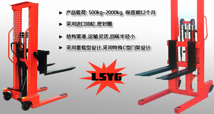 【產(chǎn)品名稱(chēng)】手動(dòng)液壓堆高車(chē),手動(dòng)堆高車(chē) 【產(chǎn)品品牌】龍升品牌 【產(chǎn)品規(guī)格】 【產(chǎn)品保質(zhì)】保質(zhì)期12個(gè)月 【是否現(xiàn)貨】現(xiàn)貨供應(yīng) 【典型應(yīng)用】適用于工廠,車(chē)間,倉(cāng)庫(kù),車(chē)站,碼頭等處的貨物搬運(yùn)與堆垛,對(duì)于那些有防火,防爆要求的場(chǎng)地(如印刷車(chē)間,油庫(kù),碼頭,化學(xué)品倉(cāng)庫(kù)等)更為適用。