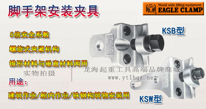 【產(chǎn)品名稱】KSB/KSW鷹牌腳手架安裝夾具 【產(chǎn)品品牌】日本鷹牌·EAGLE CLAMP 【產(chǎn)品保質(zhì)】保質(zhì)期12個月 【分類】日本EAGLE鷹牌鋼板鉗 【用途】建筑作業(yè)用腳手架的安裝、船內(nèi)作業(yè)用腳手架安裝現(xiàn)場、安裝鋼鐵構(gòu)筑物用腳手架 【適用鋼鐵】H型鋼、L型鋼、山型鋼、T型鋼等