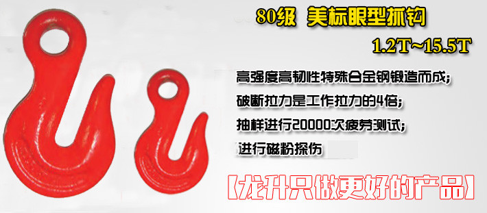 【產(chǎn)品名稱】80級(jí)美標(biāo)眼型抓鉤,G80眼型抓鉤 【產(chǎn)品品牌】龍升 【產(chǎn)品規(guī)格】1.2T~15.5T 【產(chǎn)品保質(zhì)】保質(zhì)期6個(gè)月 【典型應(yīng)用】配合鏈條、鋼絲繩等組成成套索具使用(調(diào)節(jié)鏈條)